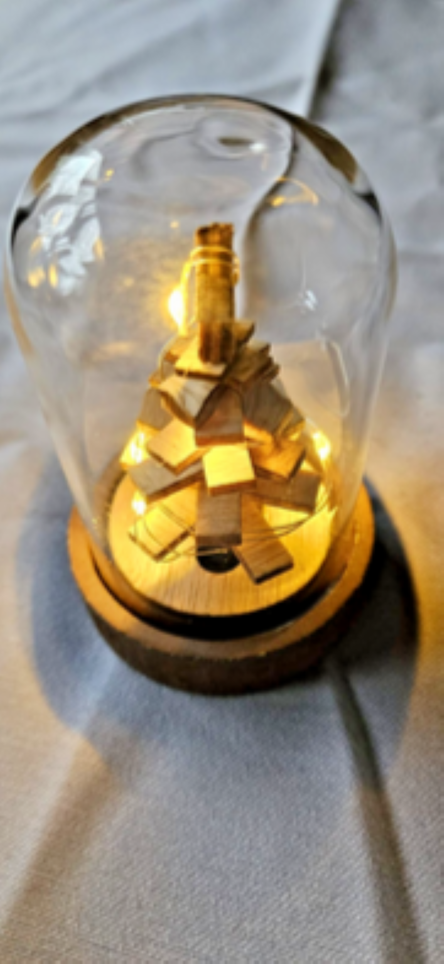 Diese filigrane Weihnachtsdekoration unter einer glasklaren Haube bringt warmes, stimmungsvolles Licht in jede Winter- und Festdekoration. Die detailreich gestaltete Miniaturszene aus Holz steht auf einem stabilen Sockel und wird von einer sanften LED-Beleuchtung erhellt – ideal für Tisch, Regal oder festliche Arrangements.