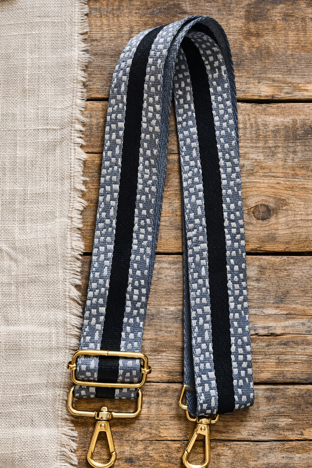 Da das Muster direkt in das Band eingewebt ist, besitzt der Gurt eine fantastische Struktur und ist extrem strapazierfähig. Die glänzenden, goldfarbenen Karabiner bilden einen wunderschönen Kontrast zu den Grautönen und sorgen für ein luxuriöses Finish.